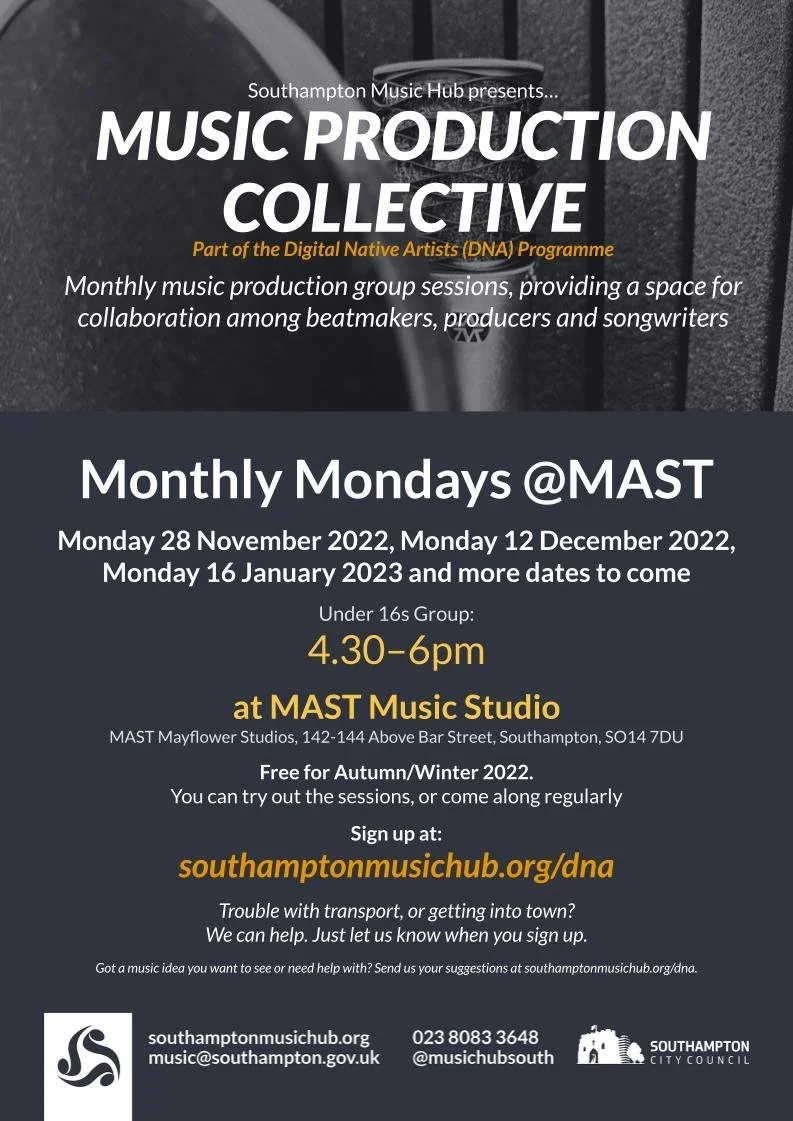 Monthly music production group sessions, providing a space for collaboration among beatmakers, producers and songwriters. You can try out the sessions or choose to come along regularly. These sessions are run as part of the Digital Native Artists (DNA) Programme.