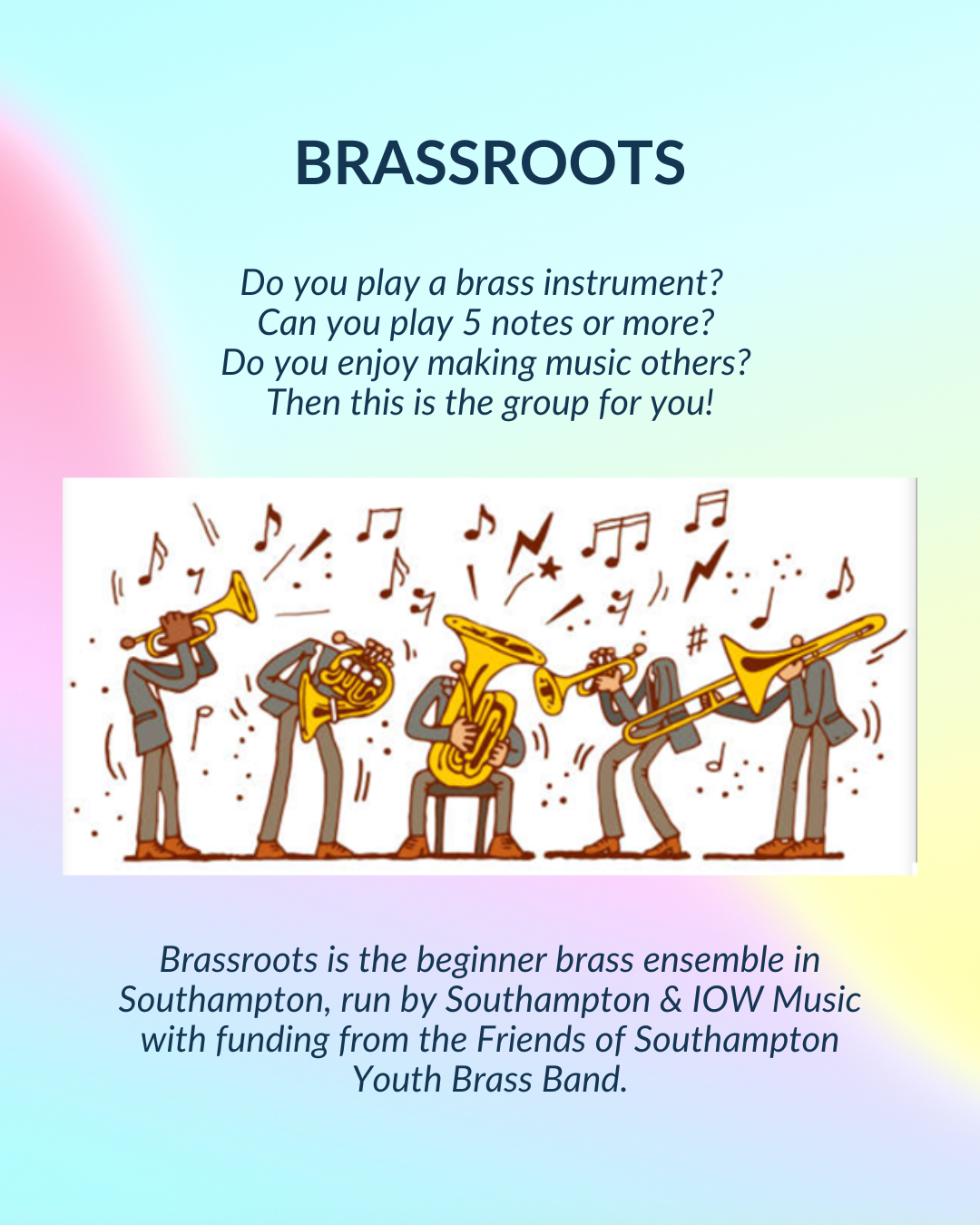 Brassroots is the beginner brass ensemble in Southampton, run by Southampton & IOW Music with funding from the Friends of Southampton Youth Brass Band.
