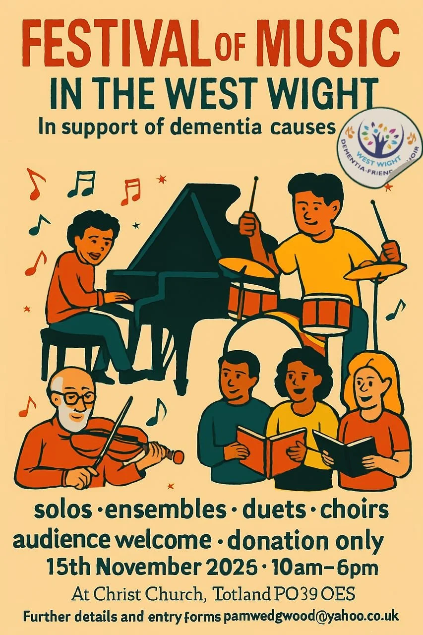 Festival Of Music In The West Wight will take place on 15 November 2025, including performances from solos, ensembles, duets, choirs. On 15 November 2025.
